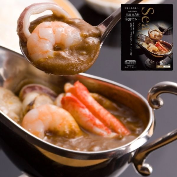 帆立・海老・蟹・イカを使用したこだわりのシーフードカレー。具材とカレーソースを分けてパウチに詰めました。