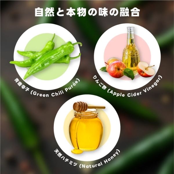 りんご酢をベースに、フレッシュな青唐辛子の辛味と香りを閉じ込めたオリジナルソースです。