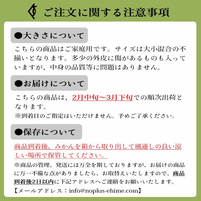 当社の柑橘は防腐剤を使用しておらず通常より傷みやすい傾向がございますので補償分として若干量多めに入れております。商品到着後はすぐに箱からみかんを取り出して暖房をかけた部屋など高温環境を避けた風通しの良い涼しい場所に保管してください。