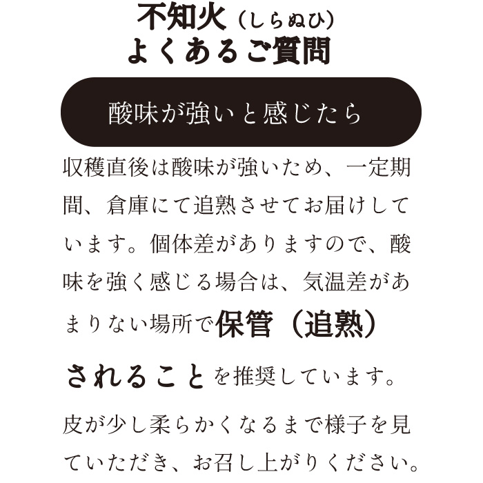 収穫直後は酸味が強いため一定期間、倉庫にて追熟させてお届けしております。