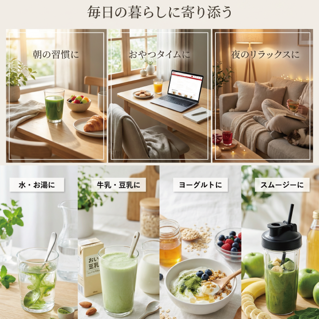 牛乳や豆乳で割れば「抹茶ミルク」のようなまろやかな味わいになり、お子様にもおすすめ。