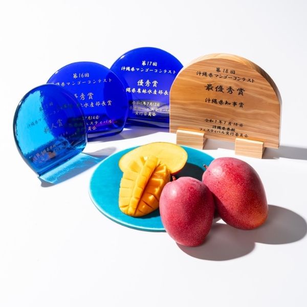 沖縄県マンゴーコンテストでは、2023・2024年に優秀賞(沖縄県農林水産部長賞)、2025年には最優秀賞(県知事賞)をいただき、その品質の高さを評価いただきました。