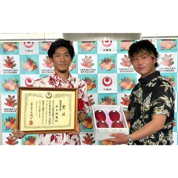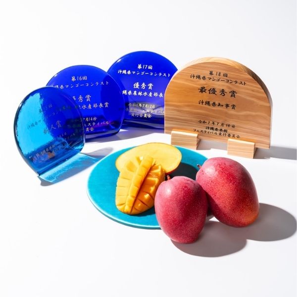 沖縄県マンゴーコンテストでは、2023・2024年に優秀賞(沖縄県農林水産部長賞)、2025年には最優秀賞(県知事賞)をいただき、その品質の高さを評価いただきました。